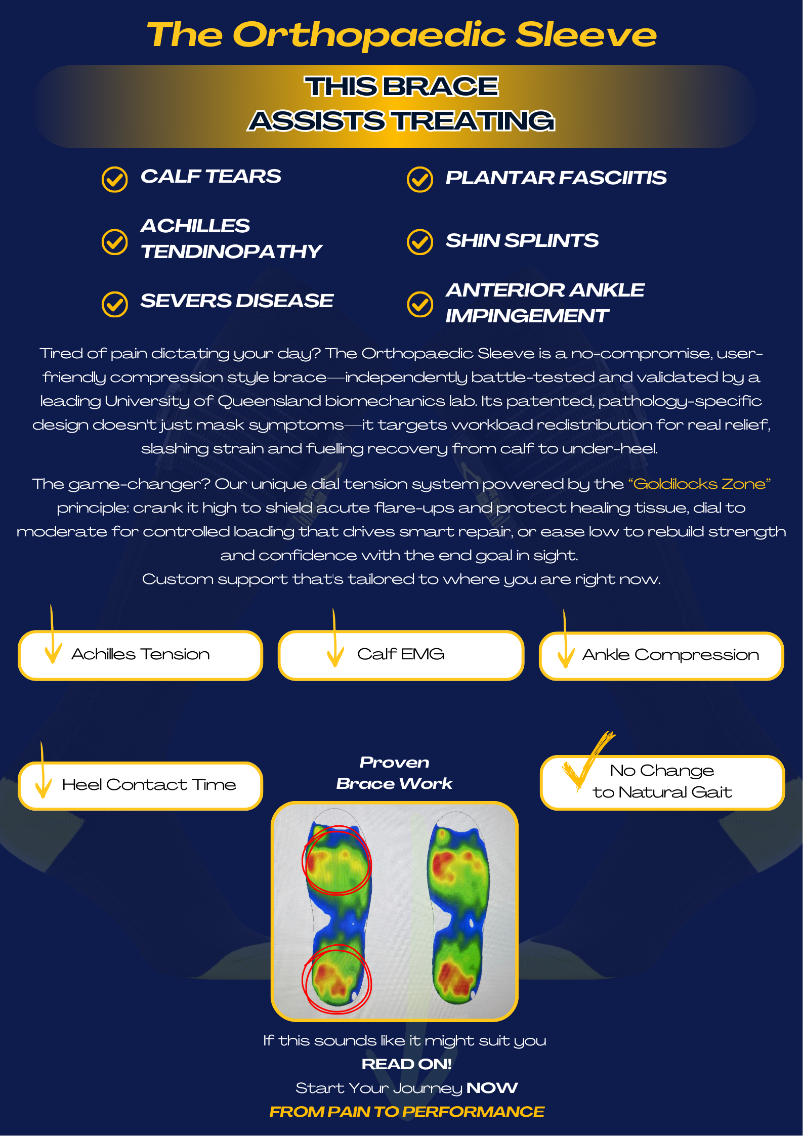 - 'The Orthopaedic Sleeve' mimics natural heel and ankle biomechanics, reducing compensatory pain patterns (e.g., limping, forefoot striking) that strain secondary joints (e.g., metatarsophalangeal, knee, hip joints).